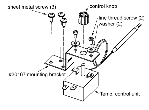 - Attach the temp. control unit to the mounting bracket using the hardware provided, then push the knob onto the control shaft.