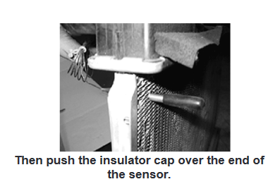 - Insert the temp. sensor thru the radiator core as close to the inlet hose as possible, then push the rubber insulator cap over the end of the sensor as shown.
