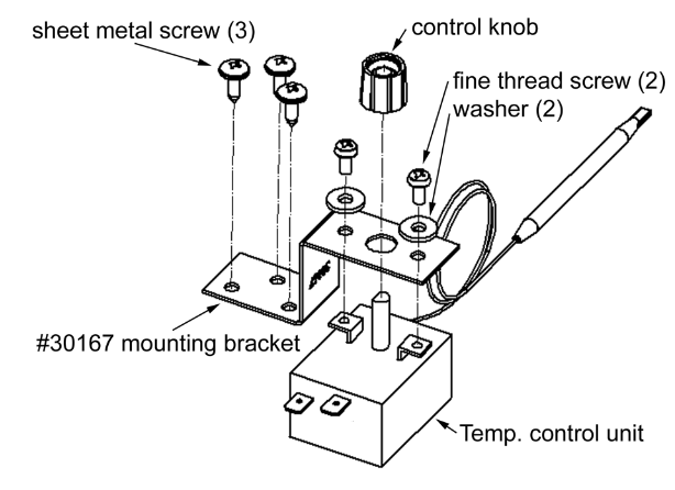 - Attach the temp. control unit to the mounting bracket using the hardware provided, then push the knob onto the control shaft.