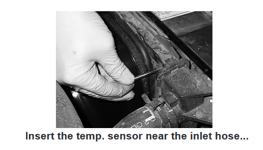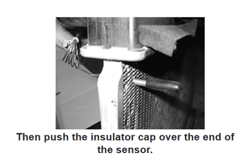 - Insert the temp. sensor thru the radiator core as close to the inlet hose as possible, then push the rubber insulator cap over the end of the sensor as shown.