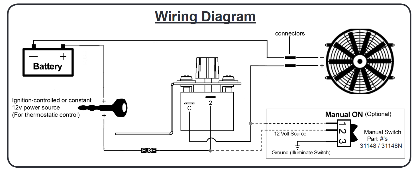 - Connect the "C" terminal on the control unit to the positive (+) lead on electric fan unit. For automatic operation, connect the "2" terminal on the control unit to a fused positive (+) source that is capable of powering the electric fan unit (refer to wiring diagram below). Use the female connectors provided.