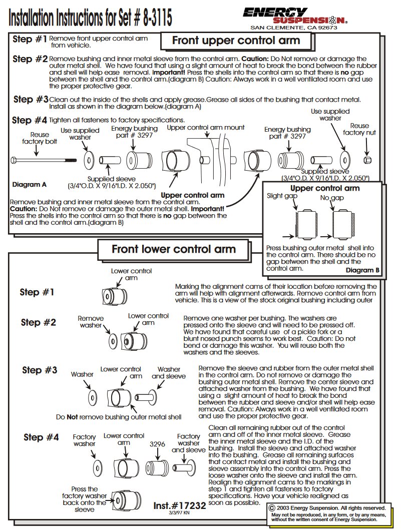 These bushings maintain proper alignment under extreme conditions on and off -road and during competition. Helps provide quicker steering response and greater vehicle control. Whatever your demands, proper alignment (caster and camber) is better maintained by the use of the correct performance durometer of the bushing's material formulation. Control arm bushings are full-floating and non-binding... especially important when ride height is altered or greater suspension load is required. Polyurethane control arm bushings do not rot or deteriorate from oils or atmospheric conditions such as ozone, smog, road salt, chemicals, and other corrosives.