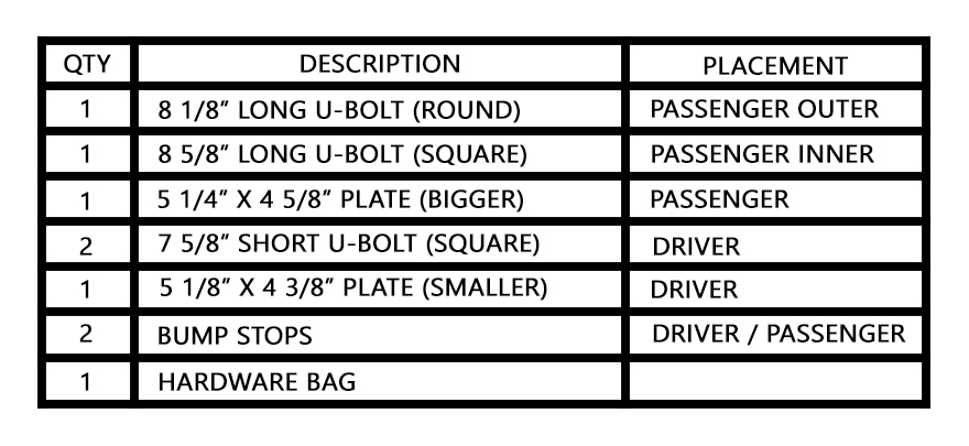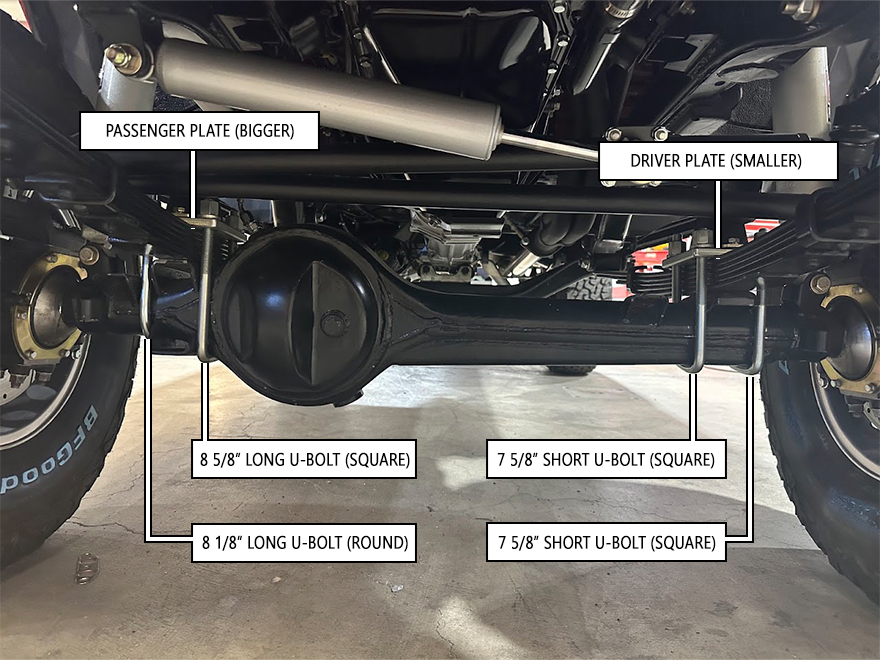 NOTE: There are (2) different U-Bolt plates for the front axle. The plate with the wider bolt spacing go on the passenger side with the wider spaced side facing inward. The driver side U-Bolts are the same size and are smaller than the passenger side. The passenger side has 1 large U-Bolt and 1 squared U-Bolt that will go on the inner side aligning with the wider spacing on the plate.