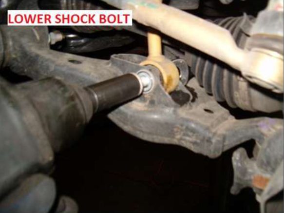 - Remove the lower shock bolts, while supporting the axle with a jack. If new shocks are being installed remove old shocks complexly. Then lower the jack allowing the axle to drop dawn as far as needed to relieve pressure on the coil springs for removal.