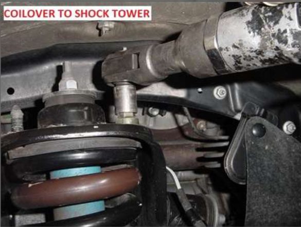 17.Position the coil-over onto the vehicle, sliding the top into the shock tower first. Install the top three nuts which hold the coil-over to the shock tower finger tight. Install the lower shock bolt and nut. You may need to pry down on the upper control arm in order to get the lower shock bolt installed. Torque upper nuts and lower bolt/nut to manufacture specs.
