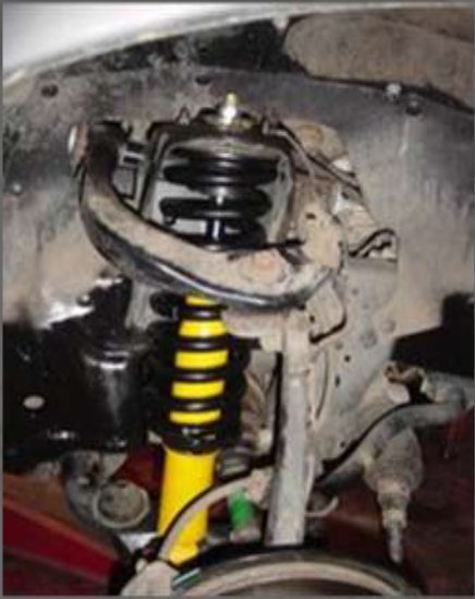 10. Secure and compress the coil using a suitable spring compressor. IF YOU DO NOT HAVE A HEAVY DUTY SPRING COMPRESSOR OR THE EXPERIENCE REQUIRED TO COMPRESS COIL SPRINGS, IT IS RECOMMENDED THAT YOU TAKE THE COIL-OVER TO A QUALIFIED SERVICE PROFESSIONAL! MANY PART STORES AND AUTOMOTIVE CENTERS CAN PROVIDE THIS SERVICE.