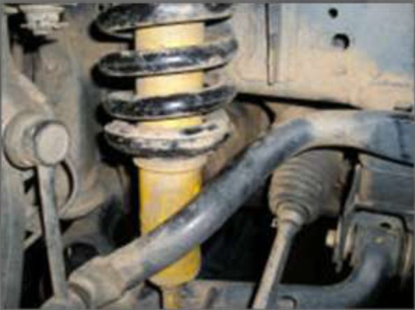 8. Being careful not to overextend and pull apart the inner CV Axle joint, move the spindle/hub assembly out of the way so that the coil-over can be removed from the vehicle. Remove the coil-over on both sides.