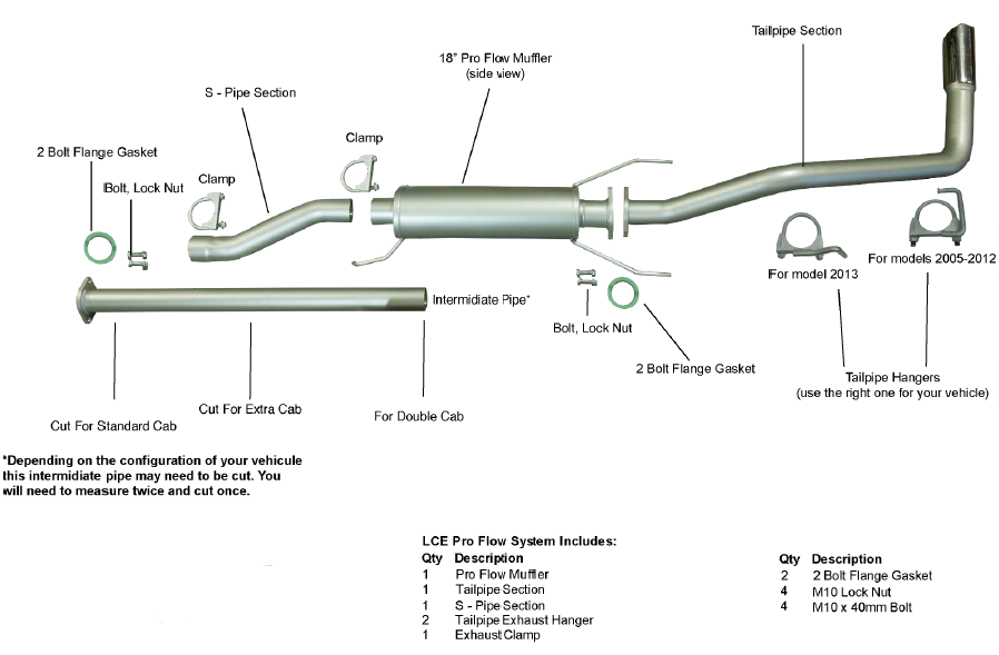 NOTE: This system is designed to fit all cab and bed configurations. The front intermediate pipe section will have to be cut to length for some applications. LC Engineering recommends using O2 safe, high-temperature silicon on slip connections to prevent small exhaust leaks.