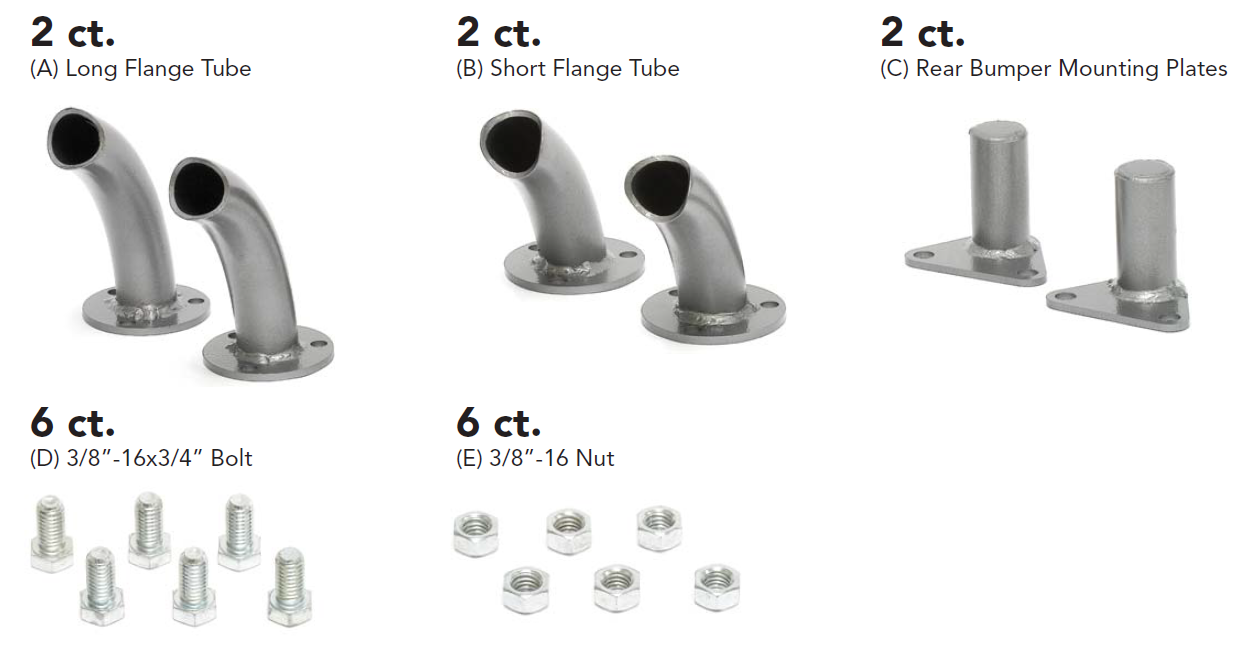 1. Bolt long flange tubes (A) to the short flange tubes (B) using the provided nuts (E) and bolts (D).