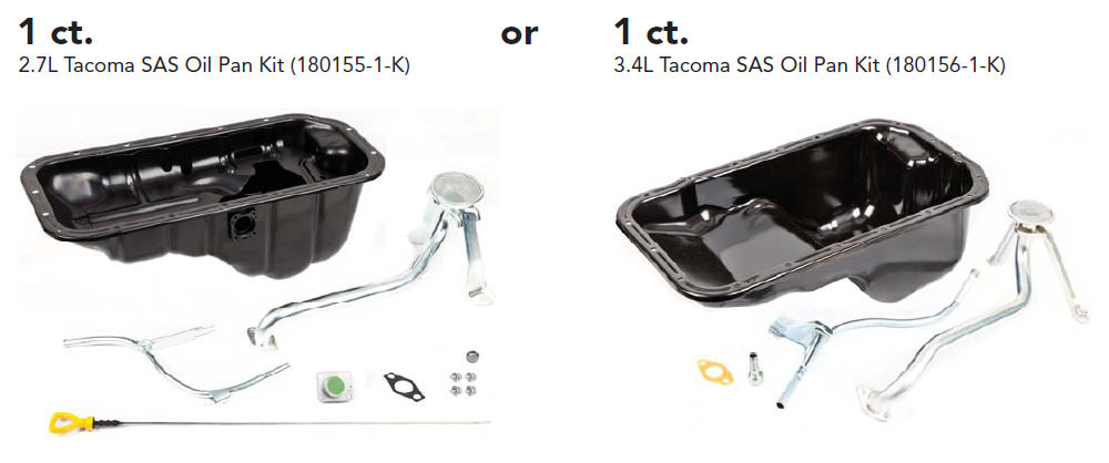 When installing a solid axle swap kit on your 95-04 Tacoma, you will notice that your stock oil pan will interfere with the new solid axle. We have solved this problem with a Rear Sump T100 oil pan kit. This kit comes with a oil pan, pick up tube with gasket, dipstick w/tube, and the freeze plug to plug the old dipstick hole to relocate the tube (only needed on some models). We also include the oil sender block plate (T100 pans have an unused oil level sender port on the side of the pan) and hardware. This kit comes with all the parts you need to convert your 3RZ engine over to the T100 pan so you can get the maximum flex out of your solid axle suspension without worrying about hitting the oil pan.