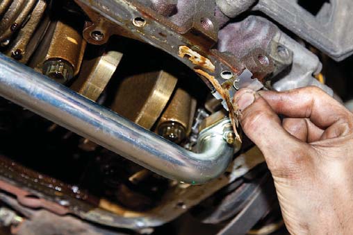 11. Fasten the dipstick tube to the motor mount.