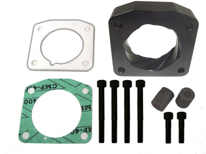 Our throttle body spacers feature a unique spiral bore that agitates the incoming air to promote better atomization of the fuel molecules, resulting in a more complete burn in the combustion chamber. These kits include a billet aluminum spiral bore spacer, throttle cable bracket relocation plate, and all the hardware needed to install the kit. These kits also include one of LC Engineering's exclusive Teflon throttle body gaskets to reduce the heat transfer from the intake manifold. These kits work great when used in conjunction with our high-flow intake tube and filter kit. Spacers and adapters are hard anodized black for long lasting good looks and durability.
