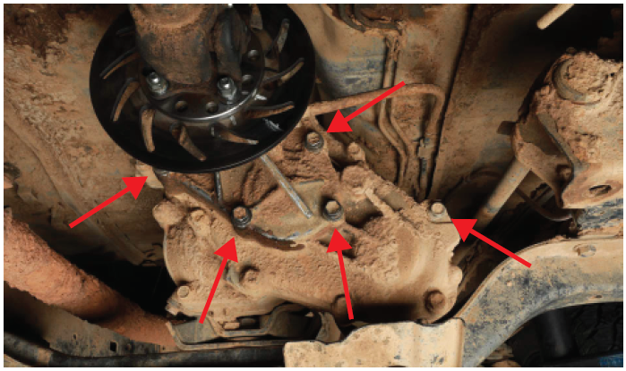 1. Disconnect the rear driveline by removing the (4) bolts holding the rear driveline to the transfer case rear output flange. Using a chisel, unstake the output flange nut. Loosen the output flange nut and remove the nut, washer, and output flange from the transfer case.