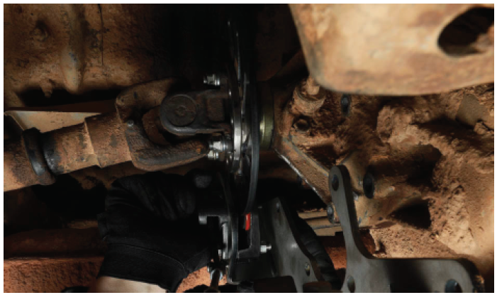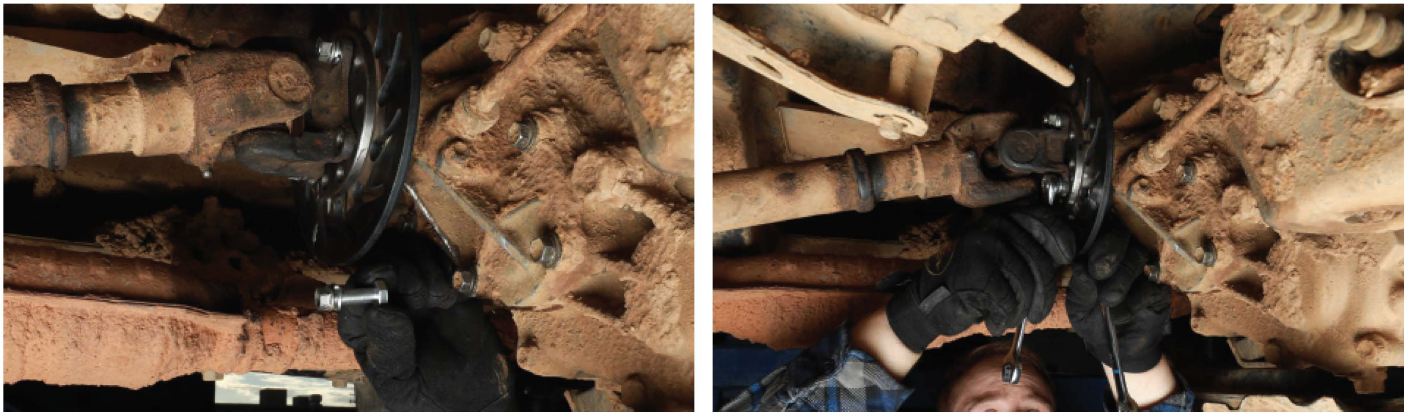 5. Align the holes in the driveshaft with the holes in the output flange and the brake rotor. Install the (4) provided M10x35MM long bolts, lock washers, and nuts as shown. Gradually tighten the bolts ensuring that there are no gaps between the driveshaft yoke, output flange, and rotor when you are done.