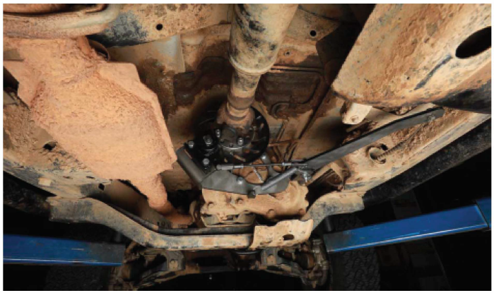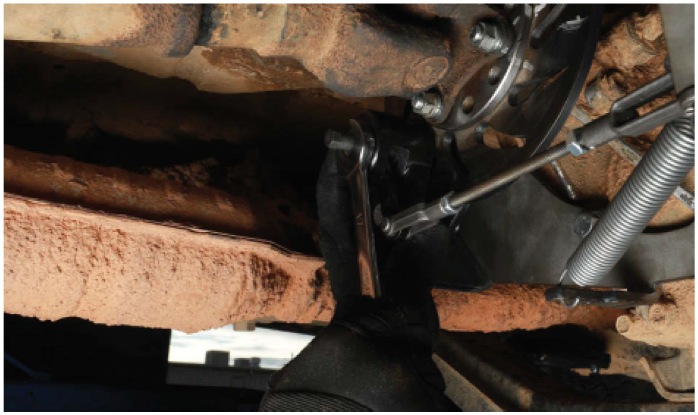 17. Test the E-brake by pulling the E-brake handle in the cab. It should only take 2-3 clicks before the E-brake is tight. Start the vehicle, put the transmission in first gear (or drive for an automatic transmission), and the transfer case in 2WD high range. For a manual transmission, when you let off the clutch the engine should stall. For an automatic transmission, when you let off the brake the vehicle should stay stationary. If the vehicle moves a large amount tighten the adjustment screw on the brake caliper and retest.