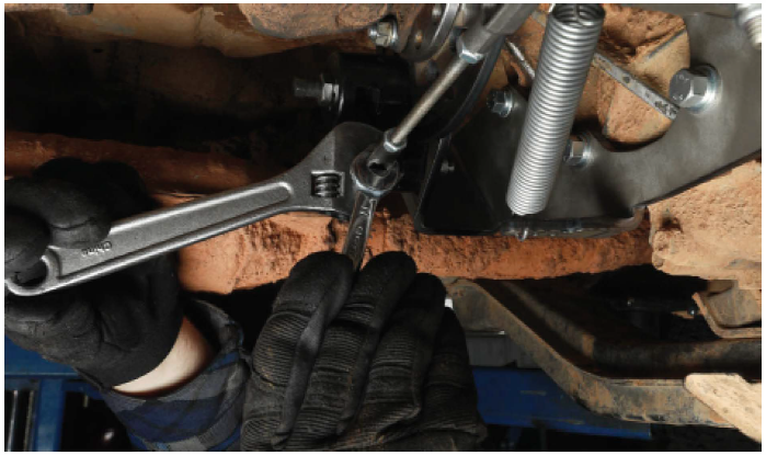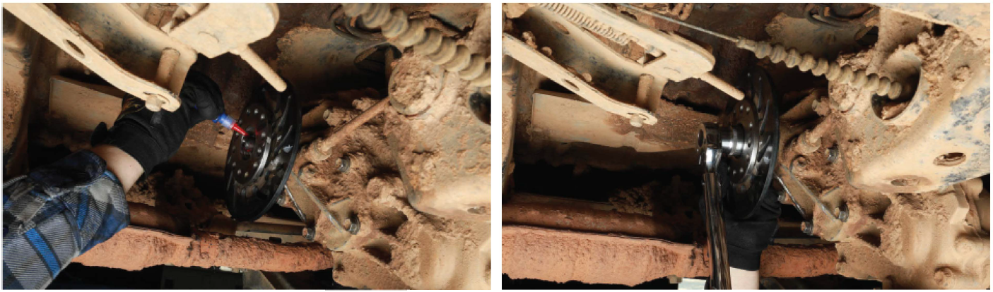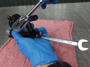 Step 11: Install the nuts. Hold the bolt with a box end wrench and tighten the nut with a socket. Once both nuts are tight, torque them to 25 ft. lbs.