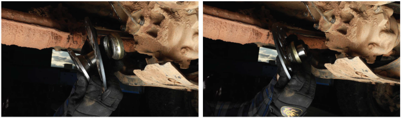 2. Remove the dust cover from the back side of the output flange and then assemÂble the provided brake rotor, output flange, and dust cover as shown. The brake rotor should be on the transfer case side of the flange.