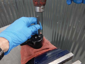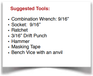 Note: If you are working alone you may want to clamp a 9/16" box end wrench in the vice to make tightening the nuts easier.