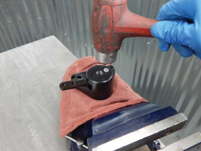Step 4: Open the bench vice jaws about 1/2" apart. Place a cloth over the vice to protect the caliper. Place the caliper on the vice with the pin centered in the opening of the vice jaws. Using a 3/16" punch and a hammer, drive the pivot pin out of the caliper housing. Next remove the lever.
