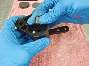Step 6: Continue installing the pin until it engages the proper hole in the lever. Then place caliper housing #1 on a solid flat surface and drive in the pin the rest of