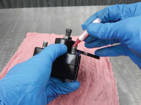 Step 10: Place caliper housing #2 on top of the caliper housing #1 and install both bolts. While holding both caliper halves and through bolts in place, turn the assembly over and apply red thread locker to the threads of both bolts.