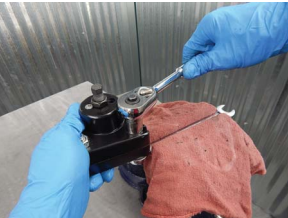 Step 1: Remove the (2) through bolts by holding the bolt with a 9/16" box end wrench and turning the nut using a 9/16" socket. Separate the two housings.