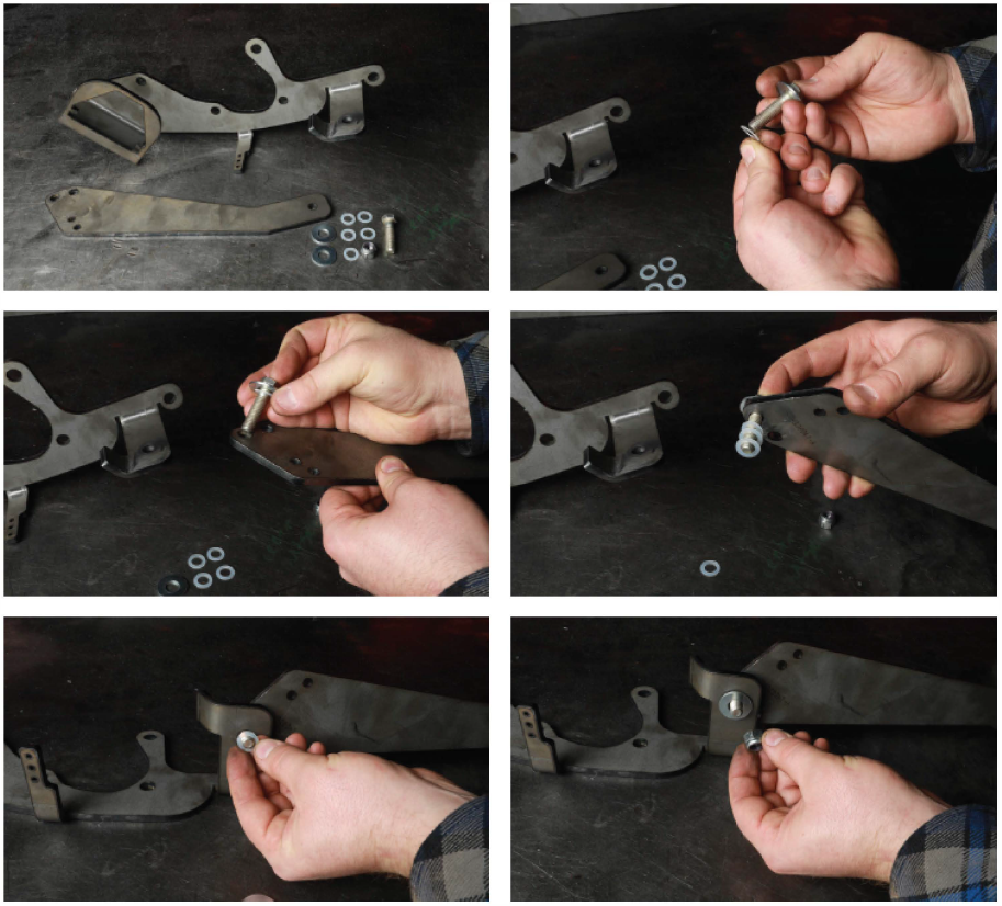 6. Bolt the E-brake arm to the main mounting bracket as shown using the provided 3/8" hardware and plastic spacer washers. It is important to place (1) plastic spacer washer between the metal 3/8" washers and the arm/mounting bracket. The remaining (3) plastic spacer washers should be installed between the E-brake arm and the main mounting brackÂet. Tighten the lock nut until the arm is snug against the mounting bracket but you are still able to rotate the arm freely.