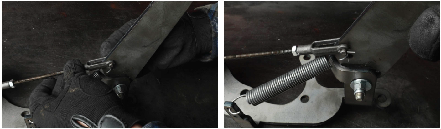 7. Attach one end of the arm return spring to the E-brake arm and the other end to one of the spring holes in the mounting bracket as shown. Multiple holes are providÂed to adjust the tension of the return spring. When the spring is hooked on both ends the arm should be fairly easy to move but should easily rotate until it contacts the tab that is bent upwards on the mounting bracket.