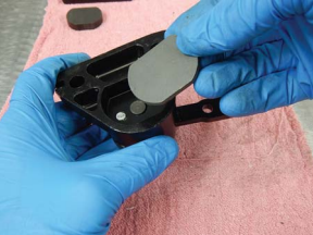 Step 9: Install the pad and secure the pad, plate, and pin in place using masking tape.