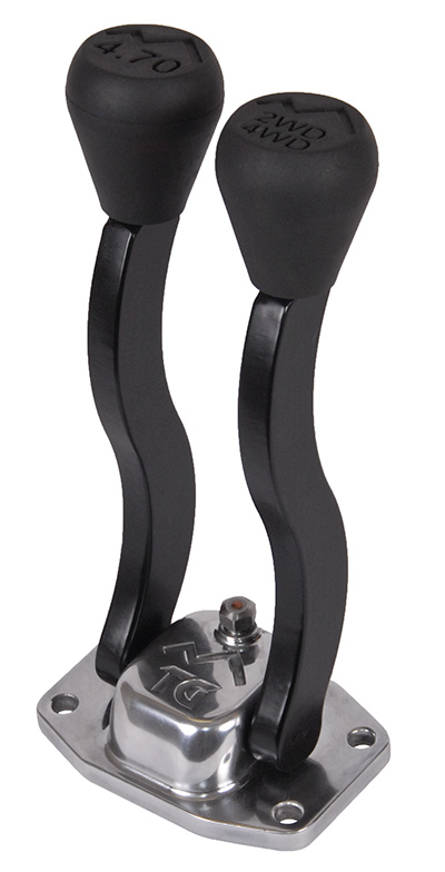 Shifter bases are made from polished cast aluminum. Shifter keys are made from heat treated 1020 steel. The internal cross pin is made from heat treated chromoly steel. A splash resistant oil breather is installed on the top of the shifter to reduce oil loss in a rollover while still allowing the transfer case to vent as needed. Each lever is sealed with an o-ring for long, trouble free operation. Twin Stick shifters are shipped with one 4.70 and one 2wd/4wd shift knob. A new cork shifter gasket is included with the kit. Reuse stock shifter base mounting bolt to attach to transfer case.