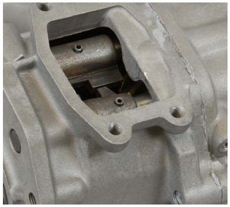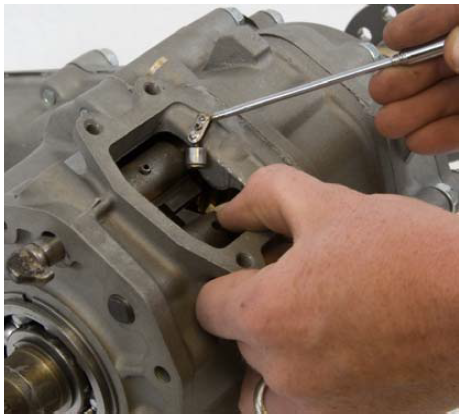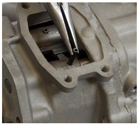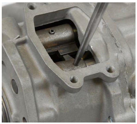 11. Using the needle nose pliers, hold the shift fork in place while sliding the shift rail into position. Be sure to maintain the proper orientation of the shift rail (see note above).