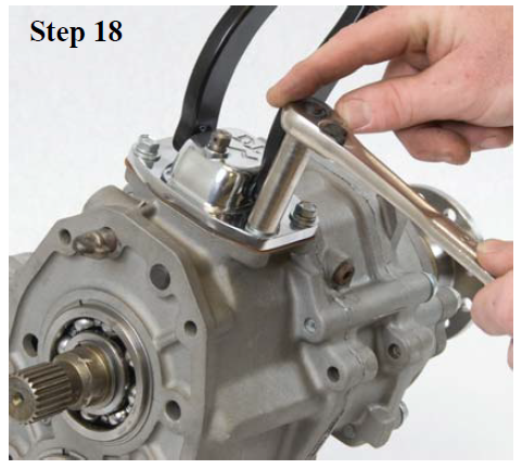 18. Using the original shifter base bolts, install the new gasket and twin shifter on the top of the t-case. Torque the bolts to 8-11 ft./lbs. with a 12mm ratchet.