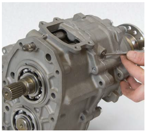 10. Using a magnetized long pin punch remove the interlock pin from the transfer case.