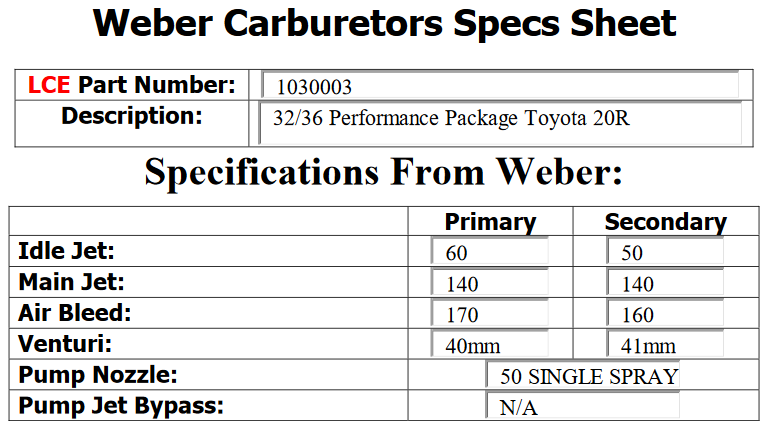 - Weber 32/36 Carb & Intake Performance Package Toyota 20R (Manual Choke), see Part #: 1030000