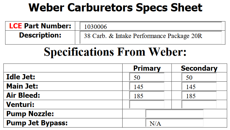- Weber 38 Carb & Intake Performance Package 20R (Manual Choke), see Part #: 1030009